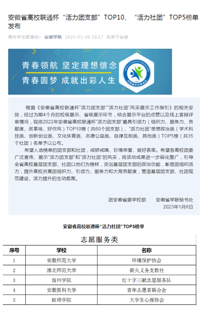 近日,由团安徽省委学校部、安徽省学联秘书处举办的安徽省高校联通杯“活力社团”风采展示活动结果公布,我校3522vip浦京集团红十字三献志愿服务队获评“活力社团”志愿公益类TOP5榜。